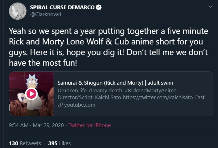 Jason DeMarco tweeted on Saturday that his team spent a year setting together with a five minute Rick and Morty Lone Wolf & Cub anime short. Jason is none but the senior vice-president and creative director for Adult Swim.